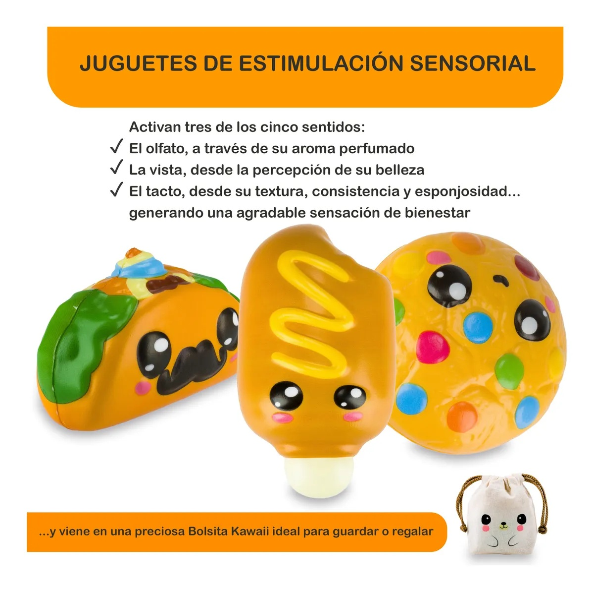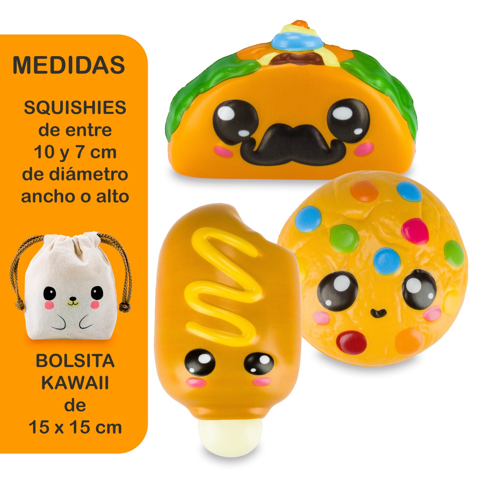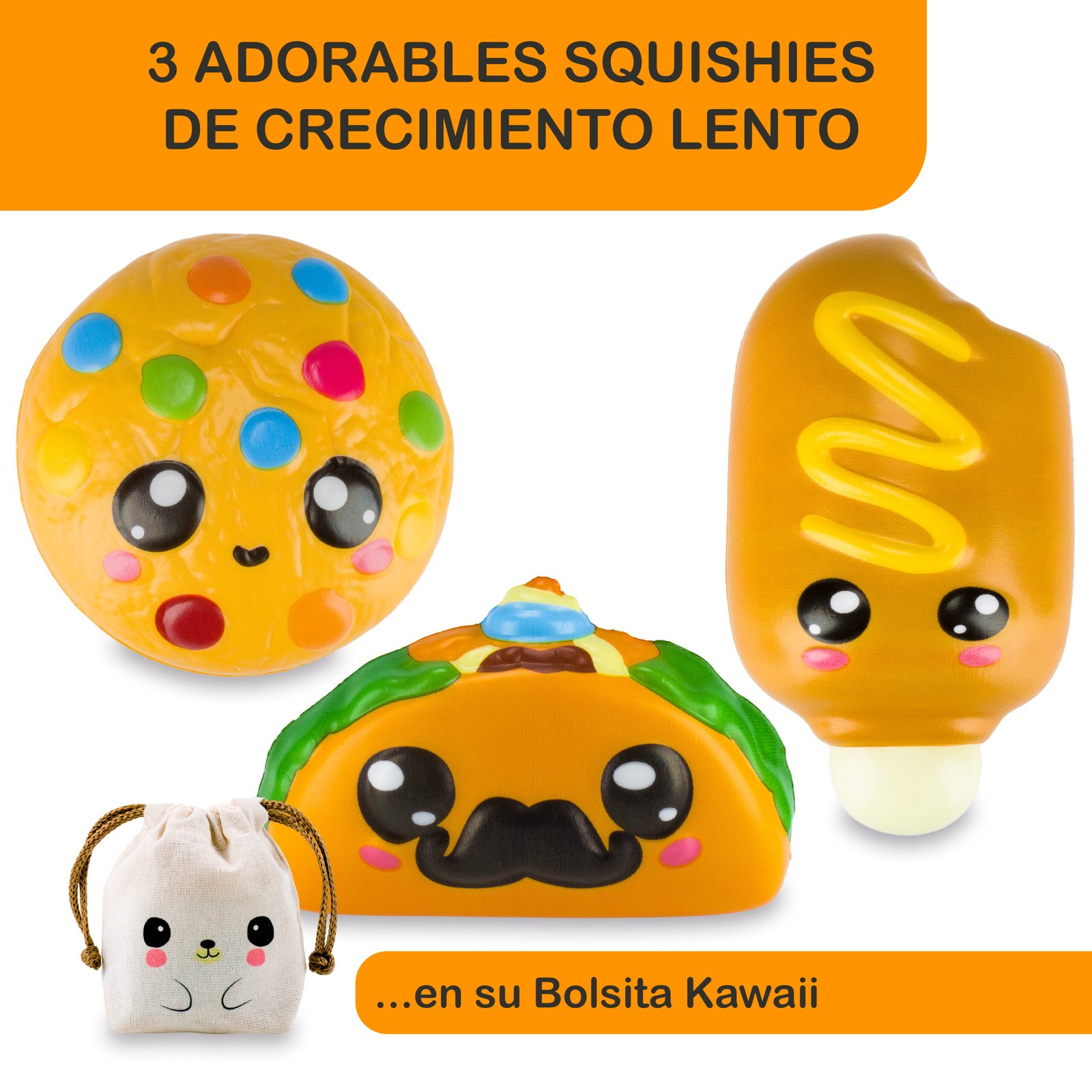 La publicación incluye tres (3) squishies + una bolsita kawaii