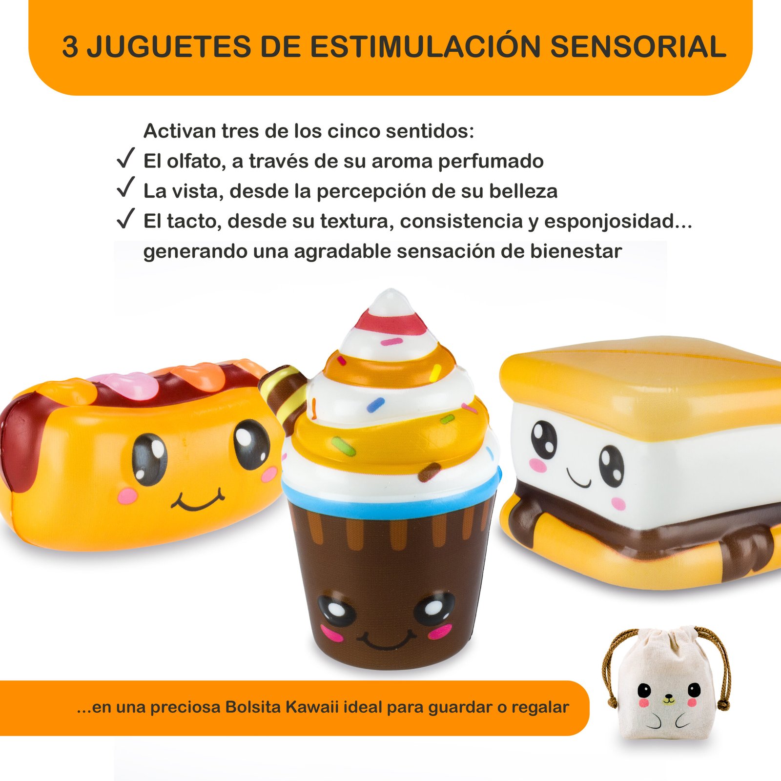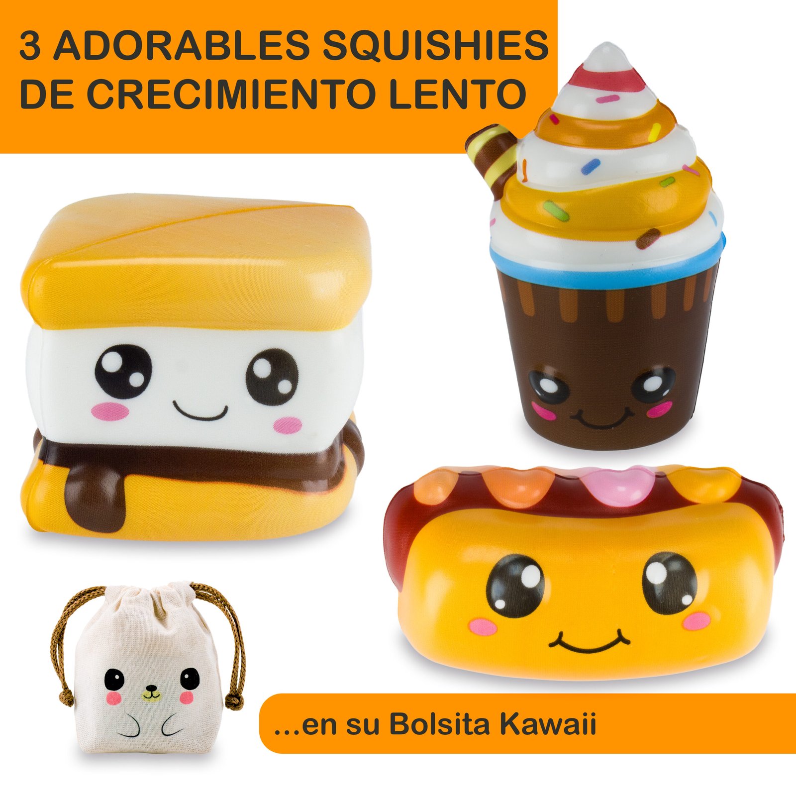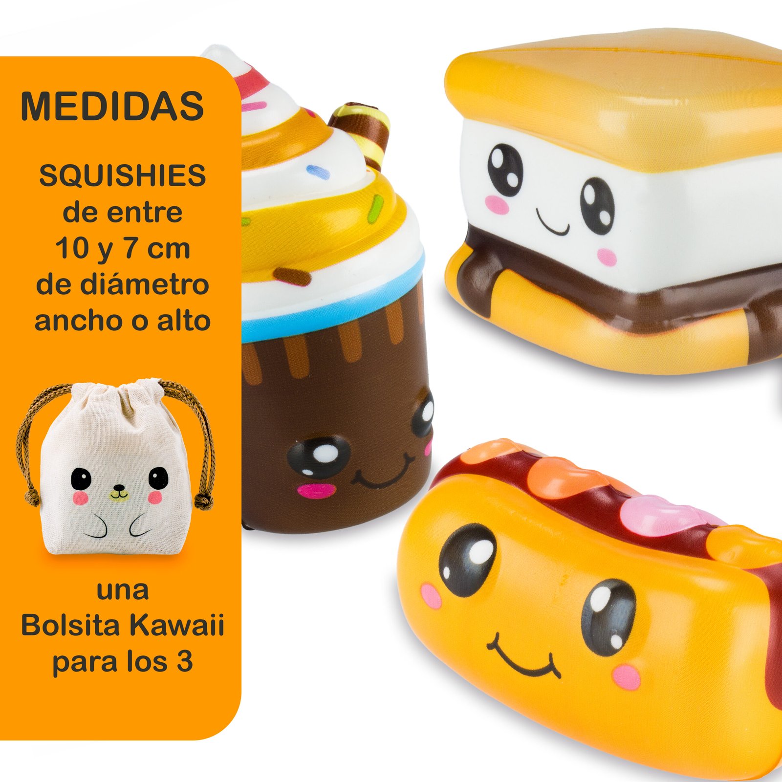 La publicación incluye tres (3) squishies + una bolsita kawaii