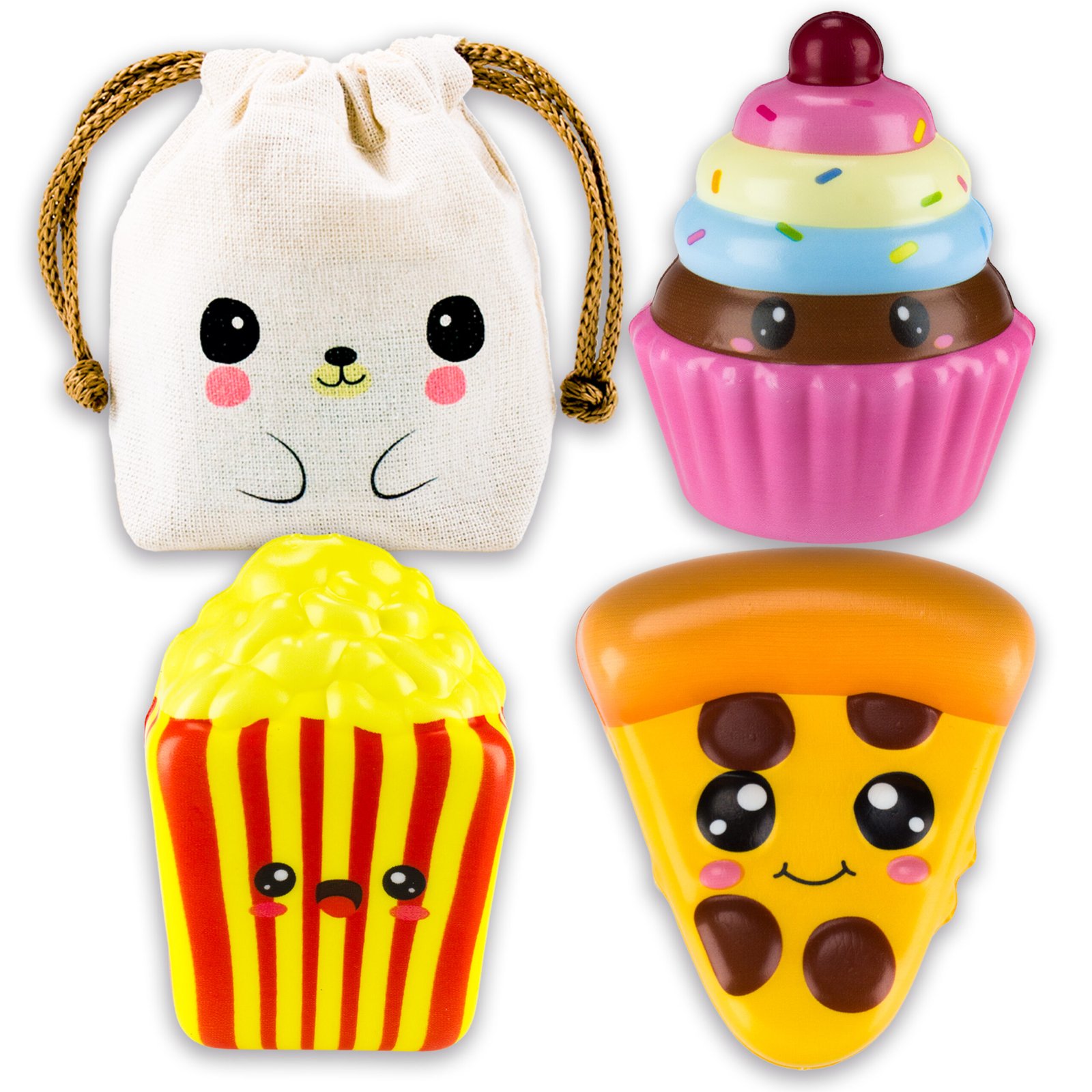 Precioso SET de 3 SQUISHIES DE CRECIMIENTO LENTO COMIDITAS + BOLSITA KAWAII de DADA TOYS, tres juguetes diseñados para brindar horas de diversión y relajación. Estos squishies medianos, con su encantador diseño de comiditas kawaii, es perfecto para niños a partir de 4 años. Su material de Espuma Poliuretanica garantiza una textura suave y agradable al tacto, ideal para apretar y liberar estrés.