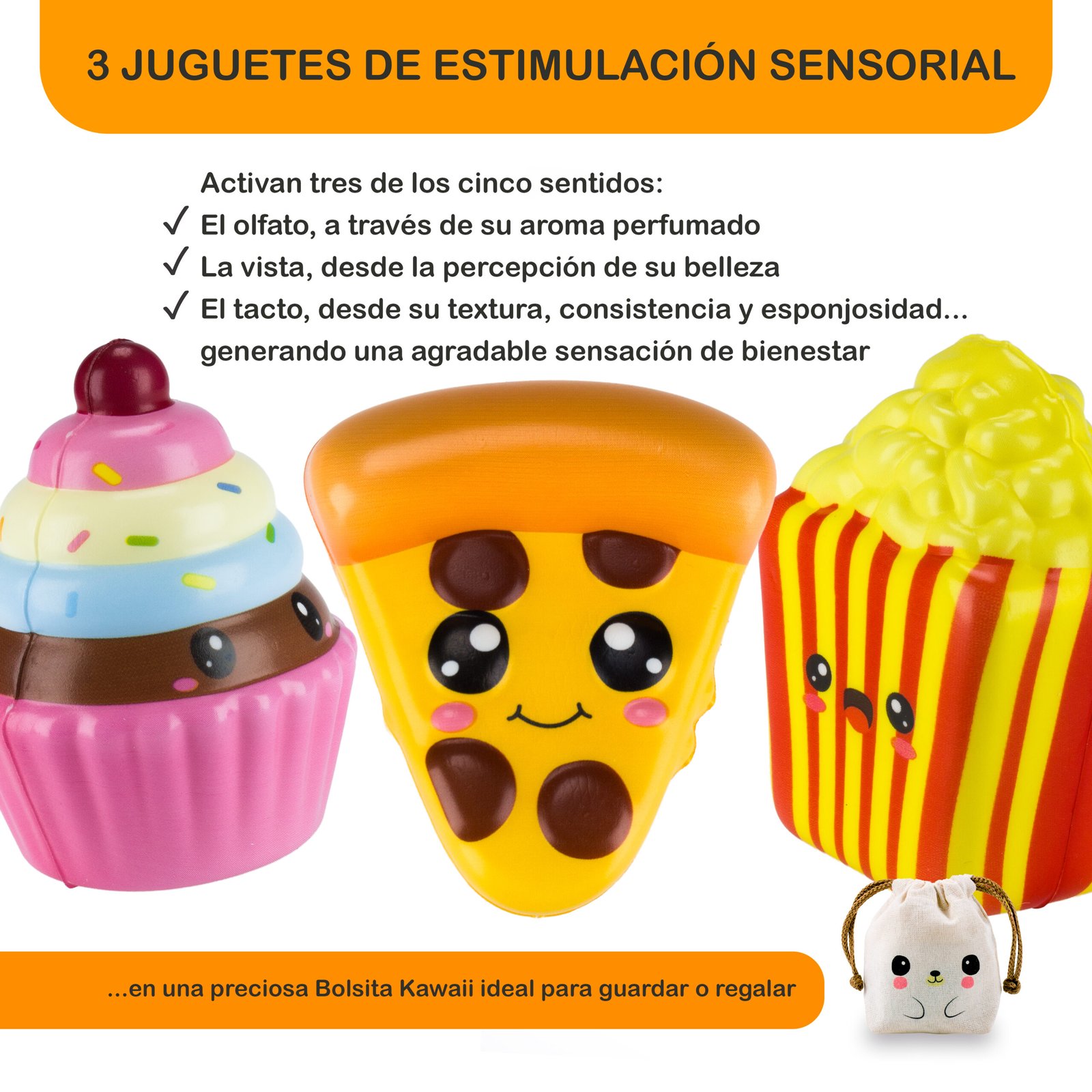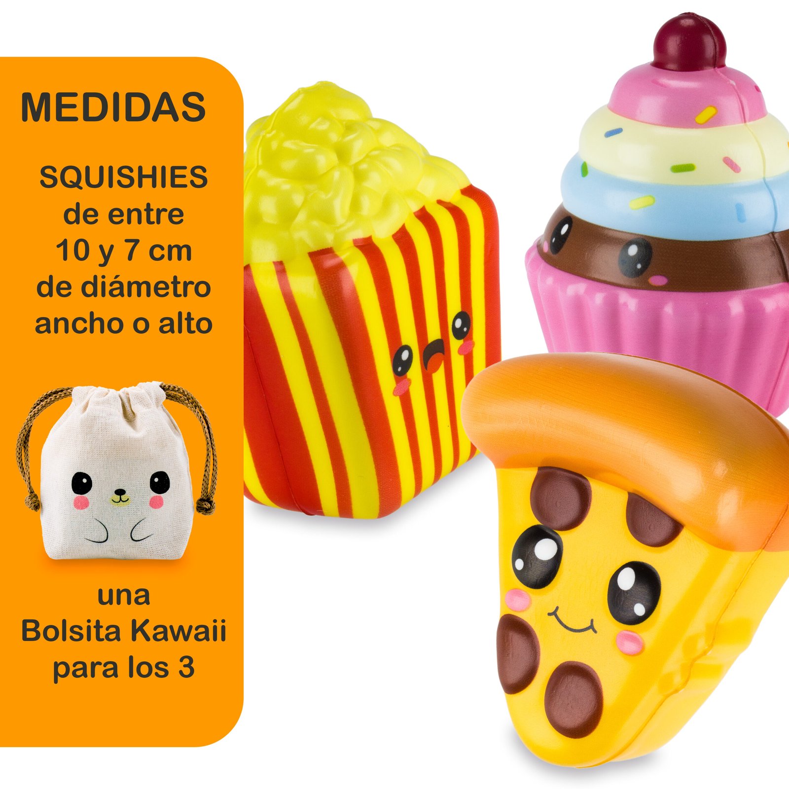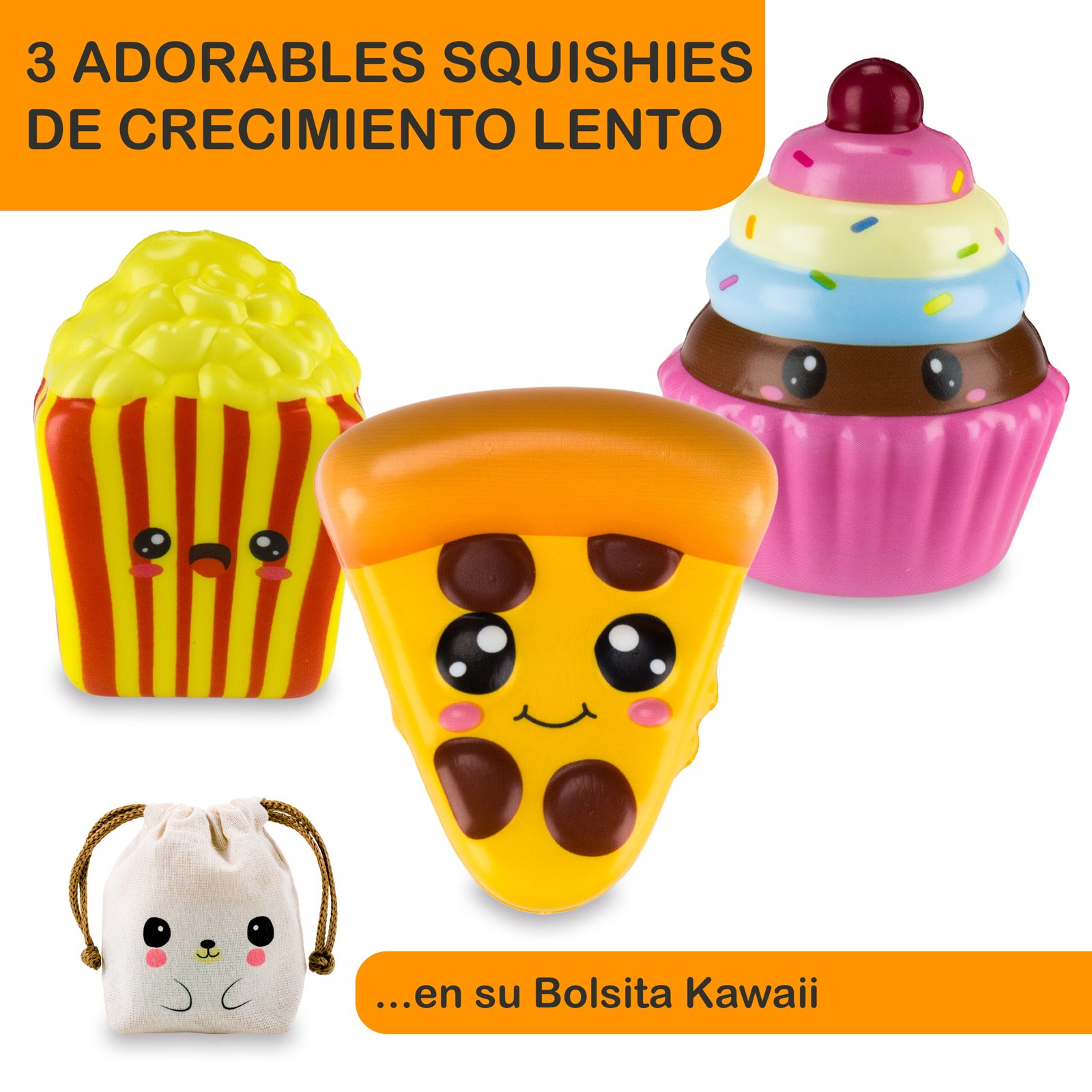 La publicación incluye tres (3) squishies + una bolsita kawaii