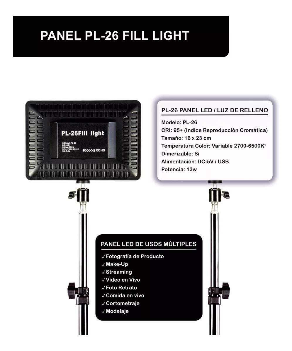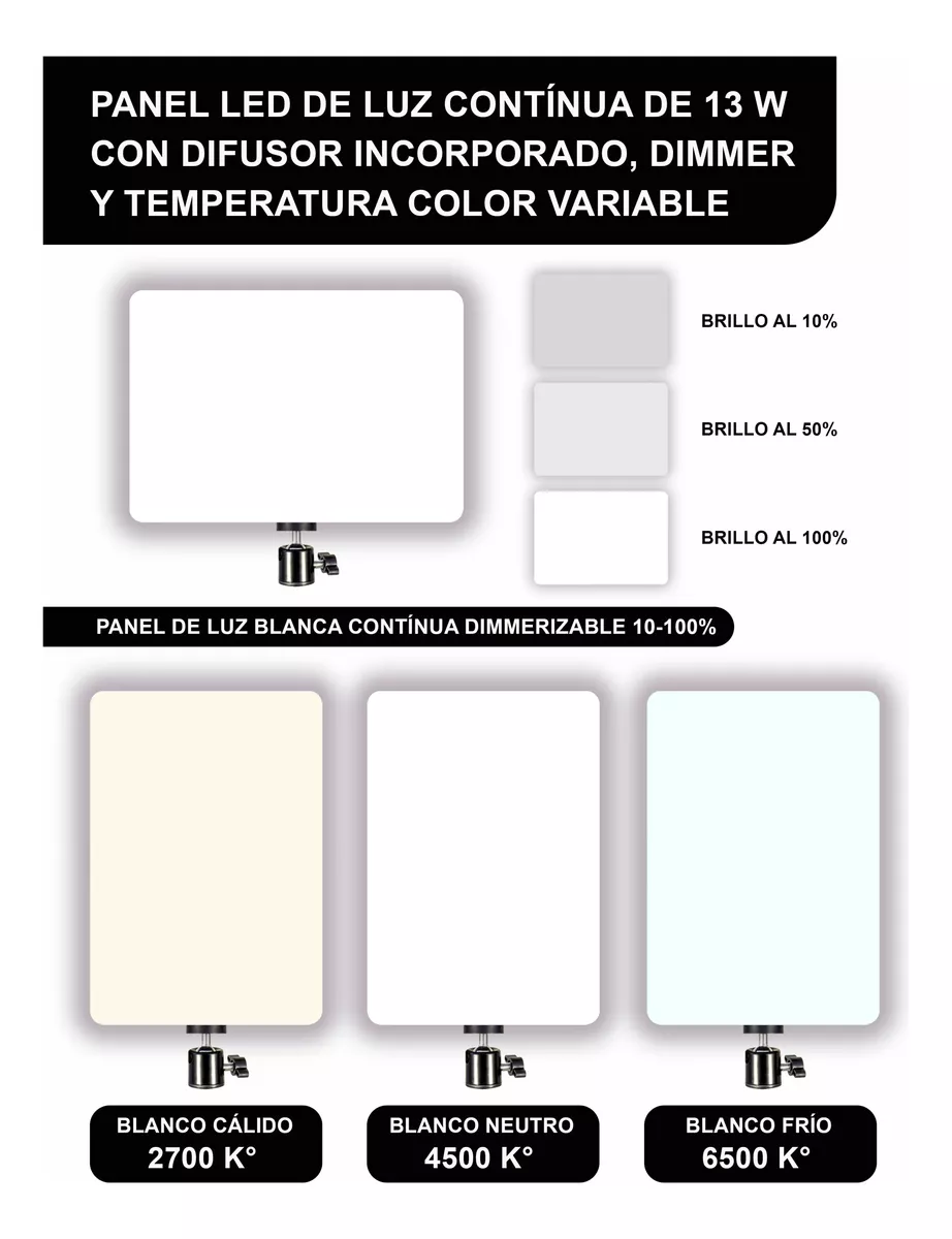 • Tipo de Luz: Panel Led de Luz Contínua ideal para Foto y Video