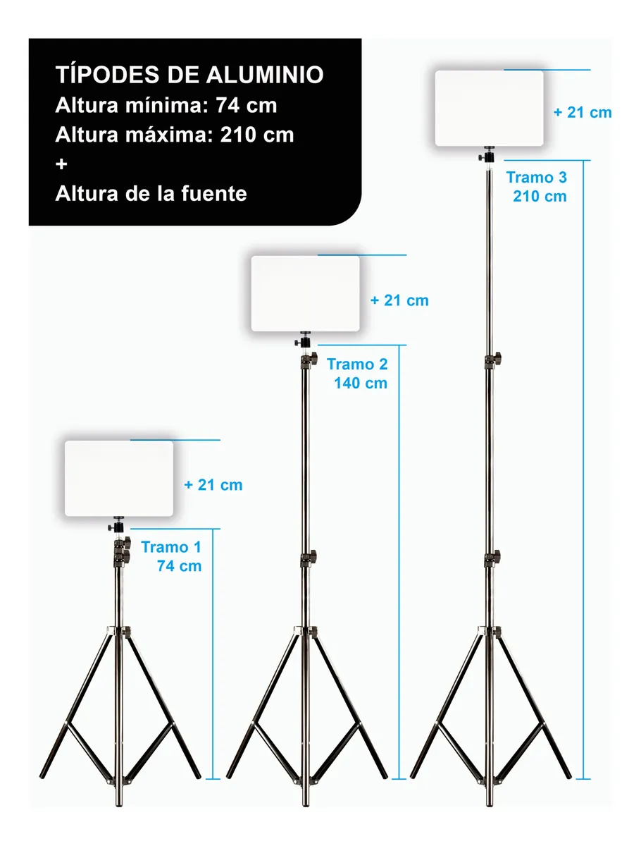 3 Trípodes de aluminio de 3 secciones y altura máxima 2,10 mts
