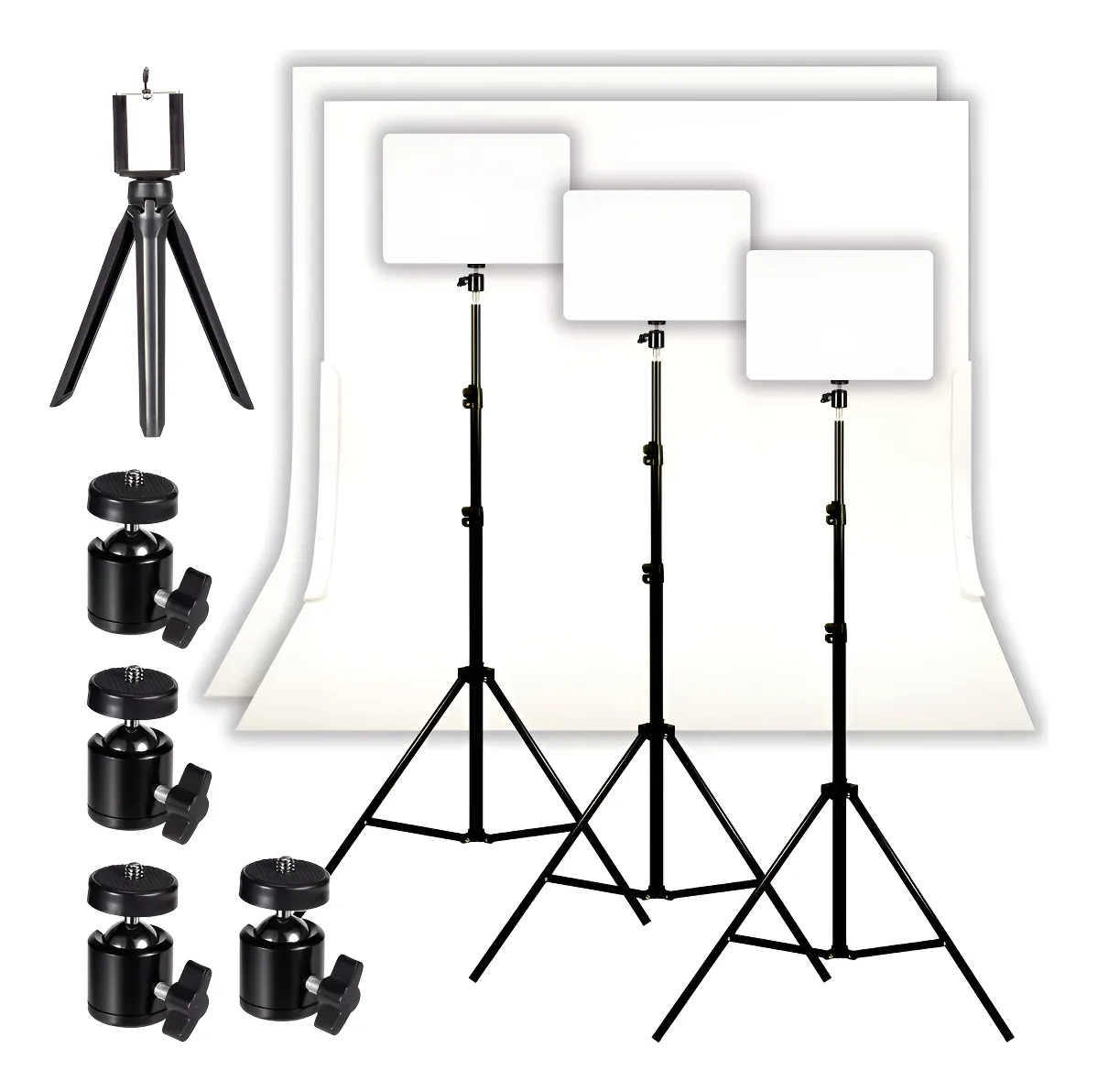 Set de 3 Paneles Led USB de 13w Dimerizables y Temperatura Color Variable (2700K°/4500K°/6500K°) para Foto Producto, Streaming, Make-up, Video y Creación Sin Fin + 3 Trípodes de aluminio de 2,10 mts + 3 Rótulas de movimiento 360°/180° + 1 Mini Trípode para Cámara o Celu con Movimiento 360° + 2 Soportes para Infinito + 2 Fondos Infinitos Blanco Doble Faz: Mate y Semi Mate.