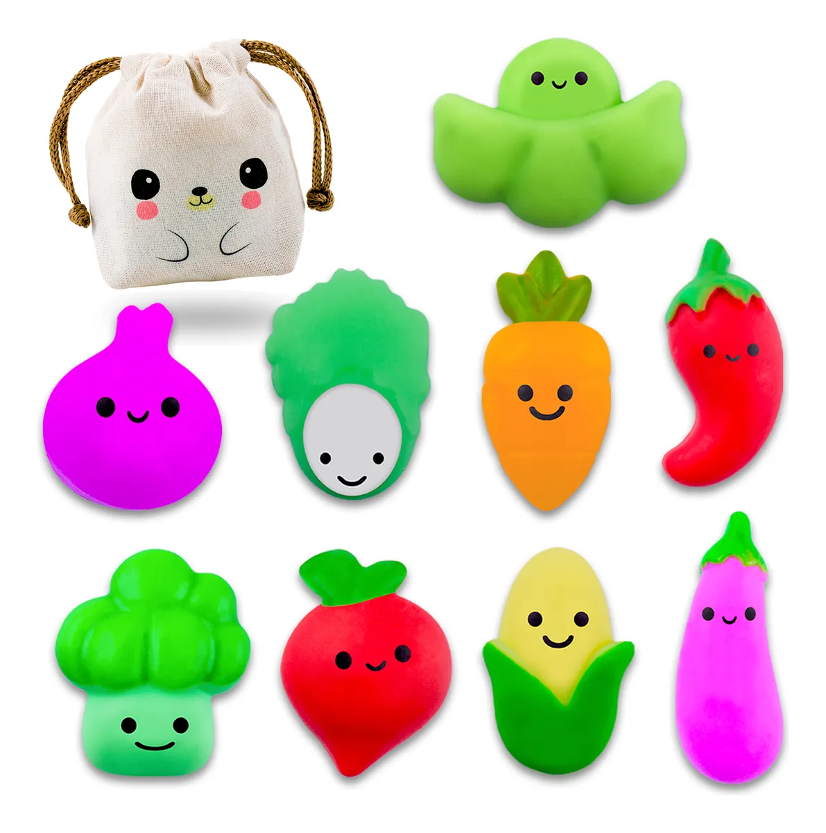 Excelente Set de 9 SQUISHY MOCHI VERDURAS marca DADA TOYS de calidad PREMIUM.