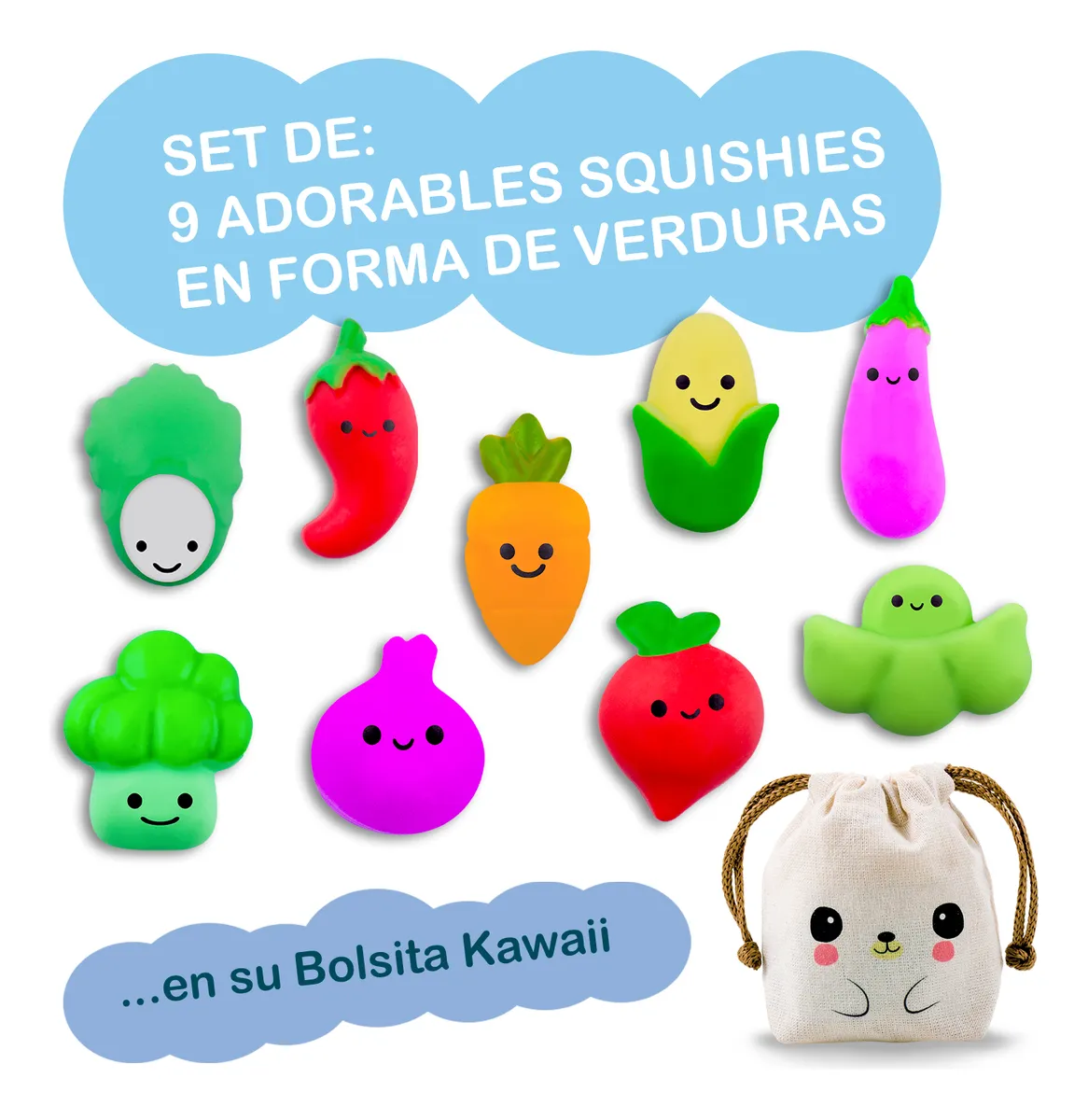 Cada squishy viene envuelto individualmente en una bolsita transparente, y el set viene en su adorable Bolsita Kawaii para poder transportarlos o regalarlos!!!