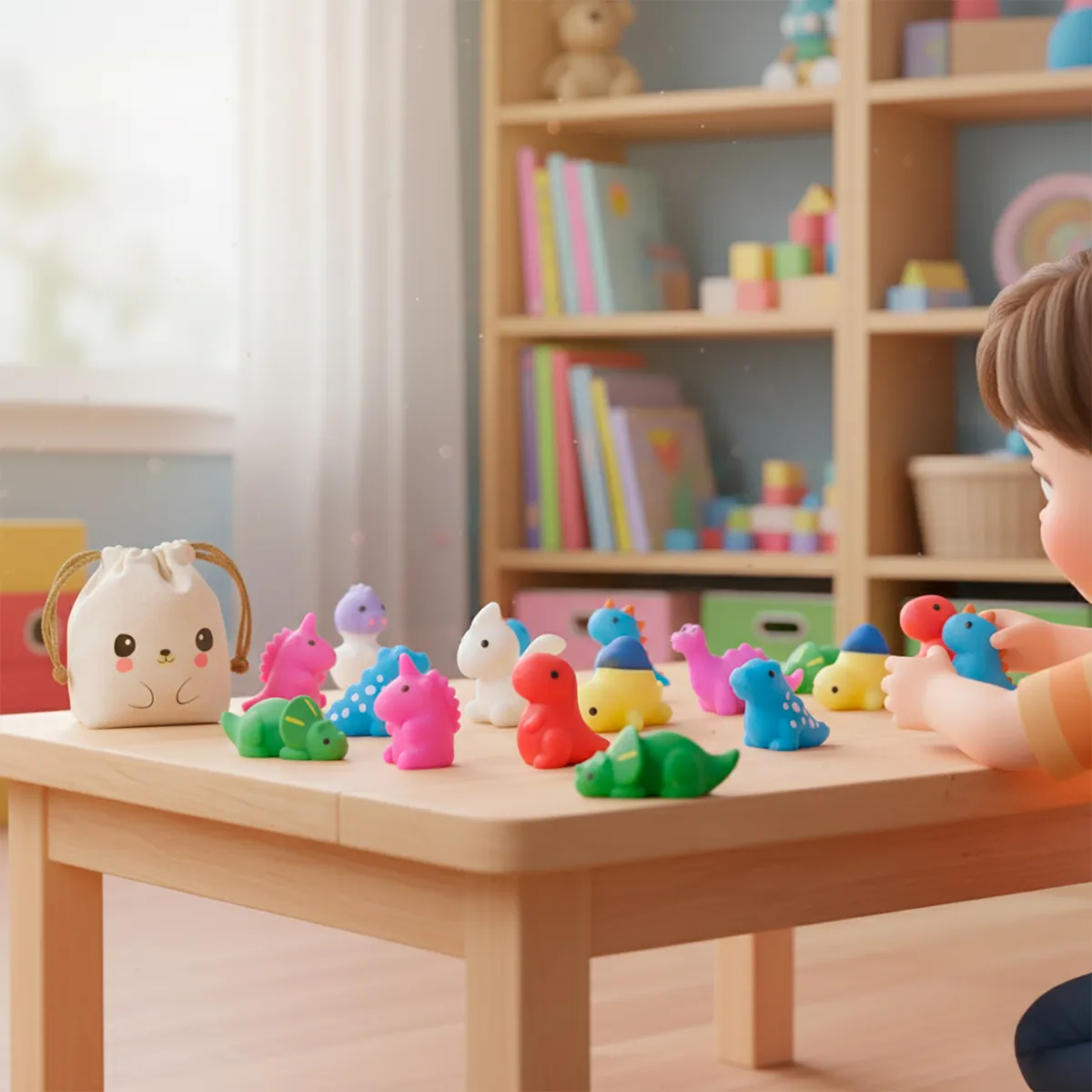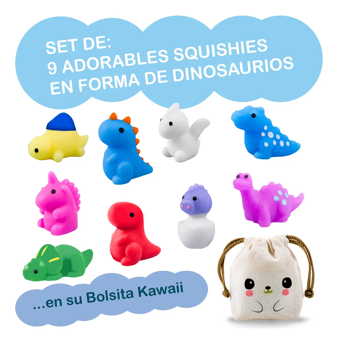 Cada squishy viene envuelto individualmente en una bolsita transparente, y el set viene en su adorable Bolsita Kawaii para poder transportarlos o regalarlos!!!